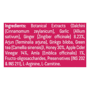 Botanical Extracts (Dalchini Cinnamomum zeylanicum), Garlic (Allium sativum), Ginger (Zingiber officinale) 8.23%, Arjun (Terminalia arjuna), Ginkgo biloba, Green tea (Camellia sinensis)}, Honey 30%, Apple Cider Vinegar 14%, Amla (Emblica officinalis) 1%, Fructo-oligosaccharides, Preservatives (INS 202 & INS 211), L-Arginine, L-Carnitine.