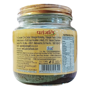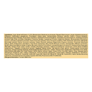 Sugar, Botanical Extracts 15.55% (Bansalochan (Bambusa arundinacea), Pippaali (Piper longum), Adusa (Adhatoda zeylanica),Shaalparni (Desmodium gangeticum), Prishnaparni (Uraria picta), Kantkari-shavet (Solanum indicum), Gokhru (Tribulus terrestris), Mudadaparni (Vigna trilobata), Bilwa (Aegle marmelos), Agnimanth (Premna integrifolia), Sonapatha (Oroxylum indicum), Gambhari (Gmelina arborea), Balla (Sida cordifolia), Mashaparni (Teramnus labialis), Kakadasingi (Pistacia integerrima Stewart), Bhumyamalaki (Phyllanthus amarus), Jeevanti (Leptadenia reticulata), Harad (Terminalia chebula), Giloy (Tinospora cardifolia), Ridhi (Habenaria intermedia), Rishabhka Microstylis wallichii), Kachur (Curcuma zedoaria), Vidaari (Pueraria tuberosa), Nagarmotha (Cyperus rotundus), Punarnava (Boerhavia diffusa), Meda (Polygonatum cirrhifolium), Neel Kamal (Nymphaea alba), Kakoli (Roscoea procera), Ashwagandha (Withania somnifera), Mulethi (Glycyrrhiza glabra), Adrakh (Zingiber officinale), Draksha (Vitis vinifera), Lavanga (Syzygium aromaticum), Shatavari bhed (Asparagus officinalis), Chabya (Piper chaba Hunter), Chitraka (Plumbago zeylanica), Dalchini (Cinnamomum zeylanicum), Chhoti elaichi (Elettaria cardamomum), Tejapatra (Cinnamomum tamala), Nagkesar (Mesua ferrea), Kali Maricha (Piper nigrum), Shankh-pushpi (Convolvulus pluricaulis), Spinach (Spinacia oleracea), Biofermented (Shiitake mushroom) – extract, Natural mixed Carotenoids), Amla Pishti 14.4% (Ghee, Amla (Emblica officinalis)), Dry Fruits Powder 2.363% (Walnut, Almond, Dates), Honey (2.6%), Cow Milk Calcium, Ghee, Minerals premix (Phosphorus, Potassium, Zinc, Calcium, Magnesium, Ferrous fumarate, Manganese, Copper, lodine, Selenium, Molybdenum, Chromium), Vitamins Premix (Vitamin B1, Vitamin B2, Vitamin B3, Vitamin B5, Vitamin B6, Vitamin B7, Vitamin B9, Vitamin B12), Nature Identical flavouring substances, Docosahexaenoic acid, Acidity regulator (INS 330), Preservative (INS 211 & INS 202).